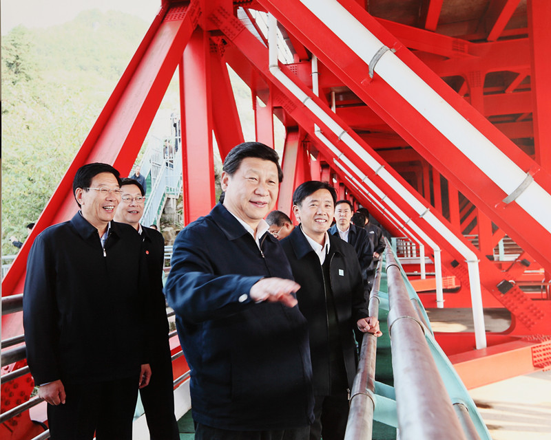 中央兩家重量級(jí)媒體《人民日?qǐng)?bào)》、央視《新聞聯(lián)播》的連續(xù)報(bào)道是黨和國(guó)家領(lǐng)導(dǎo)人對(duì)集團(tuán)承建的矮寨大橋的肯定與褒獎(jiǎng)的延續(xù)。矮寨大橋在建和建成通車后,多位黨和國(guó)家領(lǐng)導(dǎo)人前往視察,讓我們?cè)俅沃販剡@些時(shí)刻:2011年6月,時(shí)任國(guó)家政協(xié)主席賈慶林視察矮寨大橋;2012年5月,時(shí)任國(guó)務(wù)院總理溫家寶視察矮寨大橋;2013年11月3日,習(xí)總書(shū)記在視察矮寨大橋時(shí)贊譽(yù):“月亮不僅僅是外國(guó)的圓,這就是中國(guó)的圓月亮!”