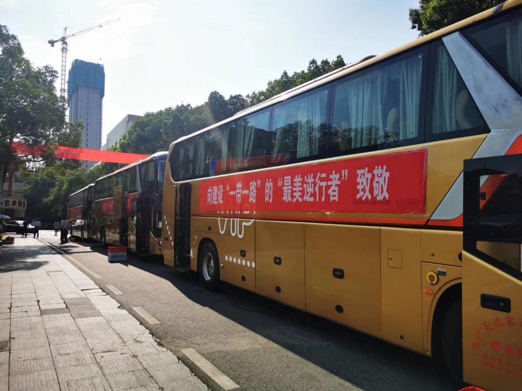 出征儀式上,湖南交水建集團(tuán)領(lǐng)導(dǎo)向赴格團(tuán)組領(lǐng)隊(duì)授 " 赴格魯吉亞復(fù)工復(fù)產(chǎn)先鋒隊(duì) " 隊(duì)旗,省國資委、湖南交水建集團(tuán)和湖南路橋集團(tuán)相關(guān)領(lǐng)導(dǎo)對團(tuán)組成員進(jìn)行慰問,贈送防疫愛心禮包,歡送這群為國際工程履約、奔赴海外的 " 最美逆行者 "。