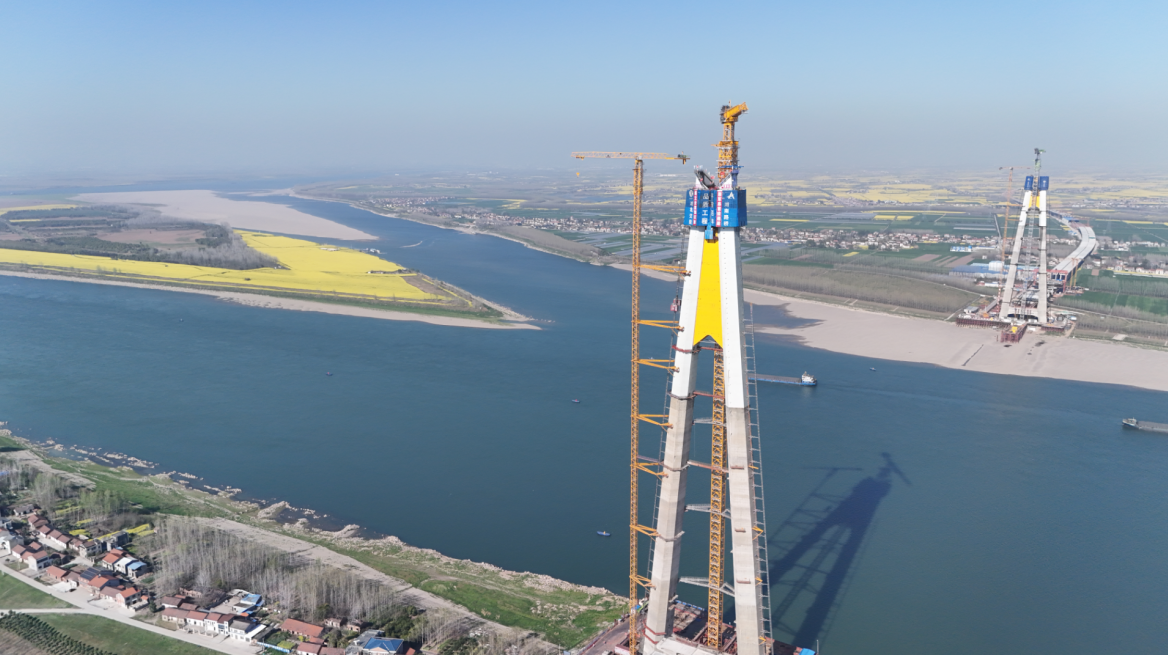 湖南路橋在這兩個(gè)關(guān)鍵領(lǐng)域持續(xù)發(fā)力,在觀音寺長江大橋施工現(xiàn)場,262米高的索塔巍然屹立于荊江大堤之側(cè),一段段超寬大截面預(yù)應(yīng)力混凝土箱梁正從自行設(shè)計(jì)的高臺支架預(yù)制后移運(yùn)至安裝位置,在智能牽引移梁及智能定位技術(shù)加持下,重達(dá)1600t的梁段正在實(shí)現(xiàn)毫米級定位拼裝。這座世界級第一大跨徑公路斜拉橋,在深水基礎(chǔ)施工突破150米“禁區(qū)”后,進(jìn)一步以1160m超大跨徑鋼-UHPC組合梁結(jié)構(gòu)挑戰(zhàn)橋梁建造極限,是湖南路橋深耕“深水基礎(chǔ)與大跨徑橋梁”領(lǐng)域的縮影。
